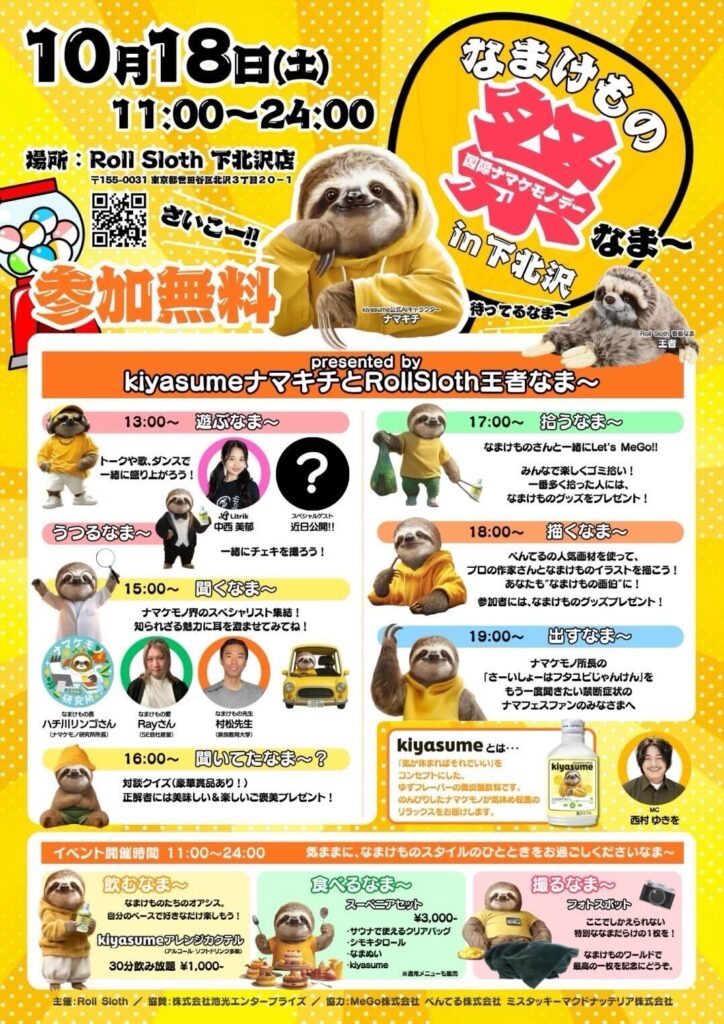 毎年10月第3土曜日は「国際ナマケモノデー」。地球の森と生態系にとって重要な存在である“ナマケモノ”を守り、関心を高めることを目的とした国際的な記念日です。本イベントはその国際ナマケモノデーを記念し、kiyasume公式AIキャラクター・ナマキチとRoll Sloth看板なま・王者がタッグを組み、丸一日“なまけもの尽くし”でお届けする1日。入場・参加はすべて無料。多彩な「なまけもの」企画を通じて、来場者の皆さまに“なまけものスタイルのひととき”をお届けします。